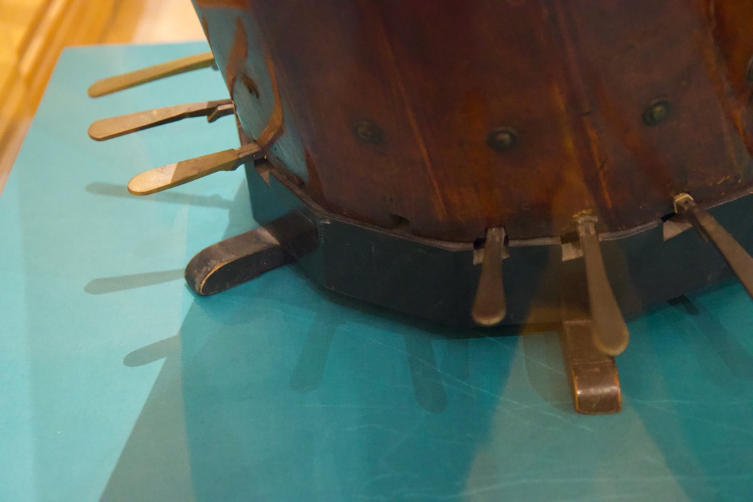 As already noted, the museum declined further examination of the instrument, or to supply more information of the known history. We do not know which are the replaced pedals, or when the pedal box was added. There are several other harps in the collection and four of them are in individual cases, allowing them to be walked around, and scrutinized. This instrument is placed in such a position, with another pedal harp immediately to its right, and a pair of keyboard instruments butted up to the side of the case it sits in, with directional lighting and projections on the wall opposite, making it difficult to see the instrument because of the reflections on the thick glass.