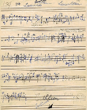 Ann Heymann's "artistic" rendering of the first of two pages containing Scott's Lamentation in Bunting's original notebook, MS 29. Ann used two different colored pens and a pencil to maintain the original's color integrity, and because of a misjudgement on her part she lengthened the sixth staff line to the left.